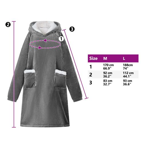 Dieser weiche Decken-Hoodie ist der Inbegriff von gemütlicher Wintermode, perfekt für entspannte Stunden drinnen in der kühlen Jahreszeit. Das oversized Design aus einer luxuriösen Fleece-Flanell-Mischung gibt dir eine sanfte Umarmung. Seine durchdachte Passform macht ihn ideal, um einen gemütlichen Abend auf der Couch zu verbringen, friedlich im Wohnzimmer zu lesen oder sogar als praktisches Kleidungsstück im Schlafzimmer. Material mit weicher Berührung: Dieser Decken-Hoodie aus einer kuscheligen Mischung aus Fleece und Flanell fühlt sich fantastisch auf der Haut an und bietet hohes Maß an Komfort. Der Stoff hält dich warm, ohne schwer zu sein, und sorgt für ein leichtes Gefühl, das beim Entspannen drinnen im Winter einfach klasse ist. Extra warme Kapuze: Die Kapuze bietet Wärme und Schutz für Kopf und Nacken. Ob beim Schlürfen eines heißen Getränks oder beim Lesen eines Buches, die Kapuze garantiert kuschelige Wärme und hüllt dich von Kopf bis Fuß ein. Praktische Tasche: Die Tasche ist super platziert und ermöglicht einfachen Zugriff auf dein Handy oder die Fernbedienung, ohne dass du deinen gemütlichen Platz verlassen musst. So wird der Hoodie noch funktionaler und sorgt für Komfort in deinen Entspannungsmomenten. Tragbares Design: Leicht und einfach zu transportieren, begleitet dich der Decken-Hoodie von Raum zu Raum und spendet dir überall Wärme. Beweg dich mühelos, während du das durchgehende warm und kuschelige Feeling genießen kannst. Einfache Pflege: Die Pflege deines Hoodies ist kinderleicht. Vermeide aggressive Chemikalien und Abrasive beim Waschen, damit der Stoff weich und lebendig bleibt. So kannst du seine Wärme ohne Sorgen genießen. ** Farbe: Dunkelgrau ** Material: Fleece und Flanell ** Gesamtabmessungen: 95 x 85 cm (L x B) ** Gewicht: 1,23 kg ** Leichtes Gewicht ** Tragbar ** Langlebig ** Praktische Taschen ** Extra-warmer Kapuze ** Einfache Pflege ** Innen- / Außenbereich: Nur für den Innenbereich ** Lieferumfang: ** 1 x Decken-Hoodie