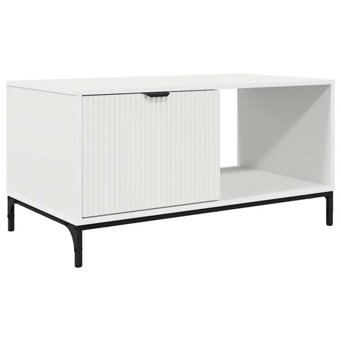 Dieser Couchtisch ist die perfekte Verbindung aus modernem Design und Funktionalität. Für Wohnzimmer konzipiert bringt seine Bauweise aus Holzwerkstoff und der schicke schwarze Rahmen eine moderne Atmosphäre und passt hervorragend zu verschiedenen Dekorstilen. Mit viel Stauraum dank seiner Fächer und klappbaren Türen ist er nicht nur praktisch, sondern sieht auch toll aus – ein ideales Stück für alle, die auf Ordnung und Design in ihrem Wohnraum Wert legen. Oberfläche aus Holzwerkstoff Der Couchtisch hat eine glatte, abriebfeste Oberfläche aus Holzwerkstoff, die einen schicken Look hat und moderne Innenräume ergänzt. Er hält lange und widersteht der täglichen Abnutzung – perfekt für Haushalte mit viel Bewegung. Pulverbeschichteter Rahmen Aus stabilen pulverbeschichtetem Stahl gebaut, gibt es eine zuverlässige Unterstützung. Die pulverbeschichtete Oberfläche schützt vor Kratzern und gibt dem Tisch einen subtilen Glanz, sodass er in jedem Wohnzimmer auffällt. Integrierte Aufbewahrungsfächer Mit cleveren Fächern und klappbaren Türen hast du eine praktische Möglichkeit, wichtige Dinge wie Magazine und Fernbedienungen zu organisieren. Jedes Fach ist leicht zugänglich, sodass der Wohnraum sauber und nett bleibt. Einstellbare Füße Mit verstellbaren Füßen steht der Tisch super stabil, auch auf unebenem Boden. Das ist besonders praktisch in älteren Häusern – so wackelt er nicht. Laschengriffe Der Tisch hat dünne Laschengriffe für minimalen Zugriff. Dieses pflegeleichte Designelement trägt zur modernen Ästhetik bei und sorgt dafür, dass du den Tisch einfach im Alltag nutzen kannst, ohne das schicke Design zu stören. ** Farbe: Weiß ** Material: Holzwerkstoff ** Gesamtabmessungen: 90 x 49 x 46 cm (L x B x H) ** Mit regal ** Maximales gewicht: 60 kg ** Montage erforderlich: Ja