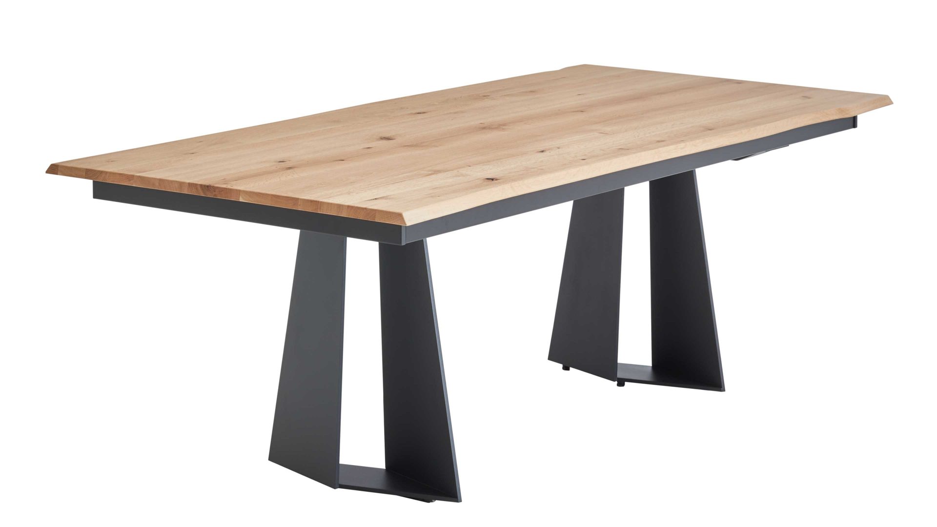 Als Highlight des Esszimmertisches fungiert die Echtholzplatte mit Baumkante. Sie besteht aus soft gebürsteter und geölter heller Wildeiche und ist ca. 25 mm stark. Für die nötige Standstabilität sorgt das robuste matt anthrazitfarbene Metallgestell.