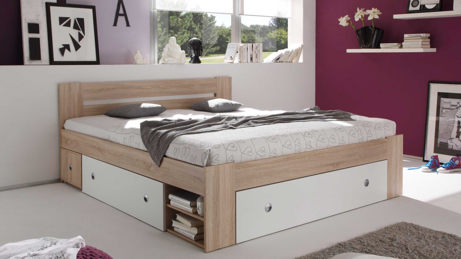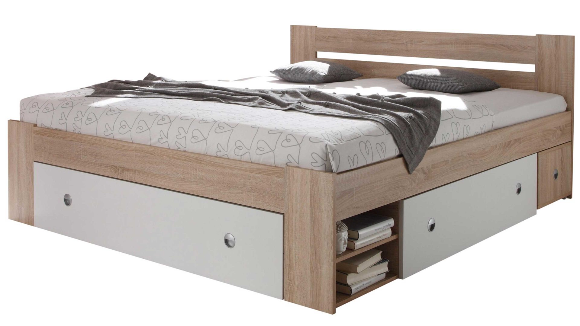 Apropos Griffe: Das Bettgestell ist mit drei Schubladen ausgestattet, in denen etwa Bettwäsche sowie Ersatz-Bettdecken und Ersatz-Kissen licht- und staubgeschützt Platz finden. Überdies beherbergt das Bett insgesamt vier offene Fächer - jeweils zwei auf der linken und rechten Bettseite. Das ist noch immer nicht alles, was dieses Bettgestell an Stauraum zu bieten hat: Es wird mit zwei Nachtkommoden geliefert, die je zwei offene Fächer mit sich bringen. Auch auf den Oberböden der Konsolen lassen sich diverse Gegenstände platzieren - beispielsweise eine Nachttischlampe und Taschentücher oder das Buch, das aktuell gelesen wird.