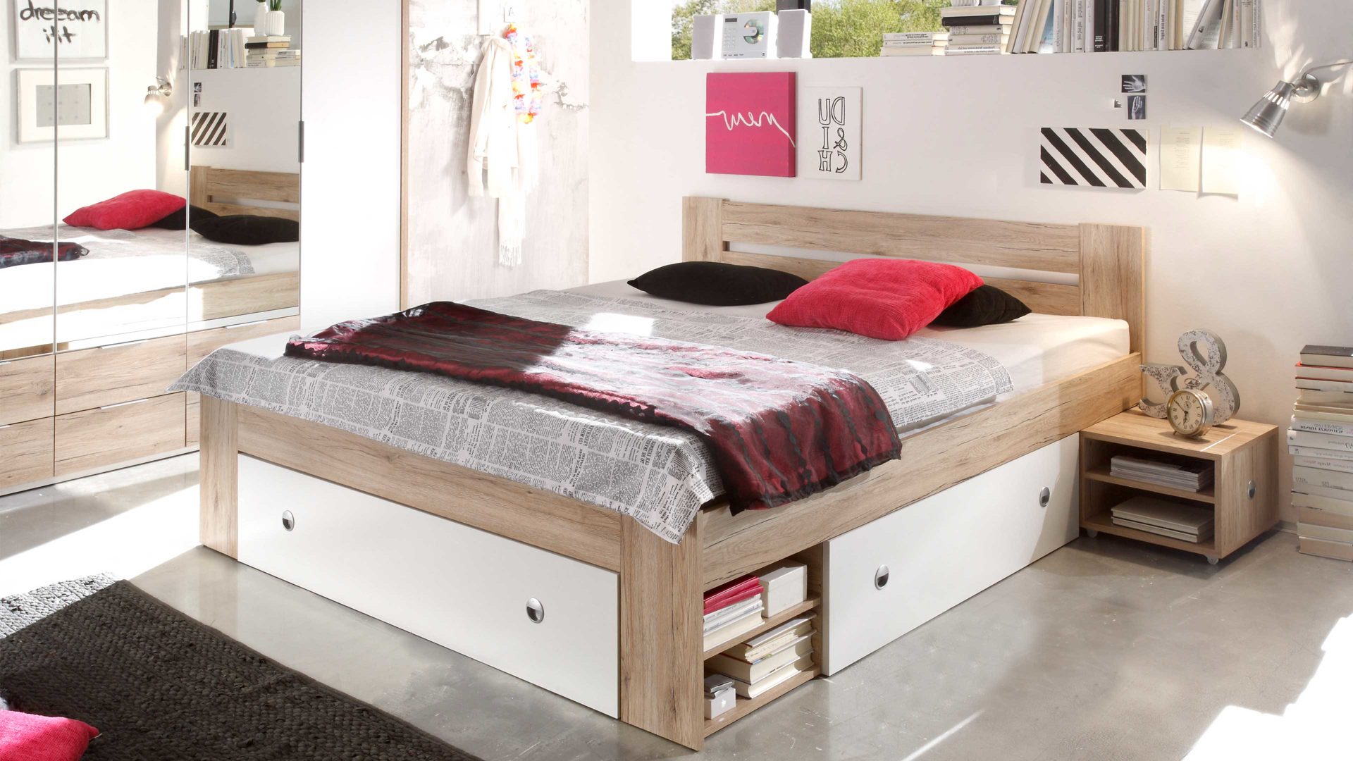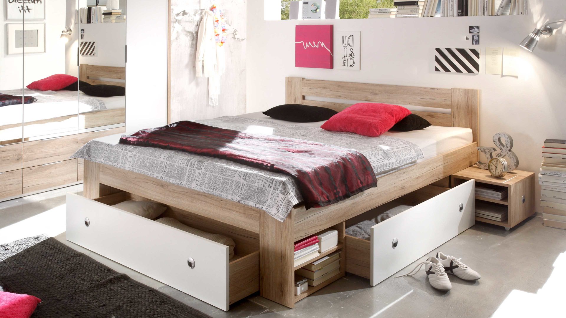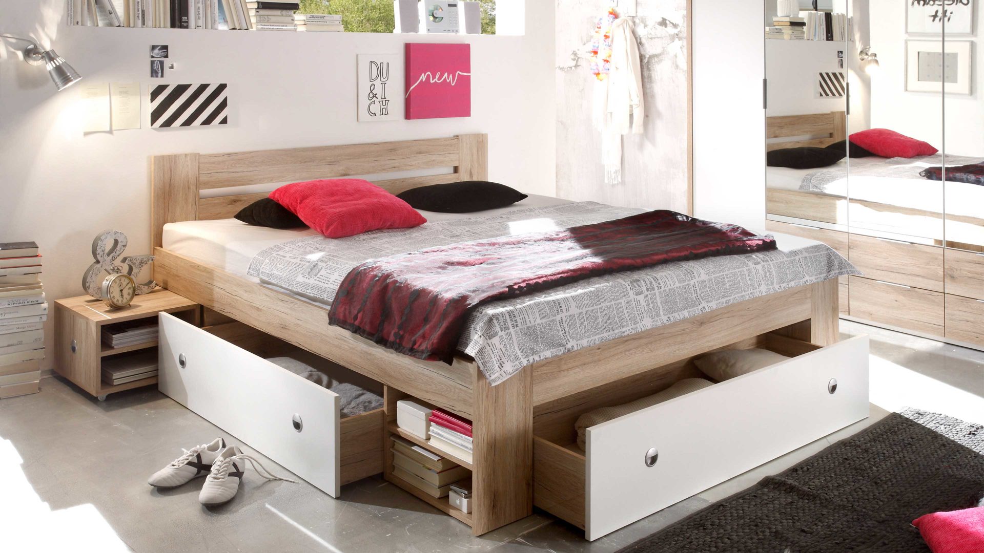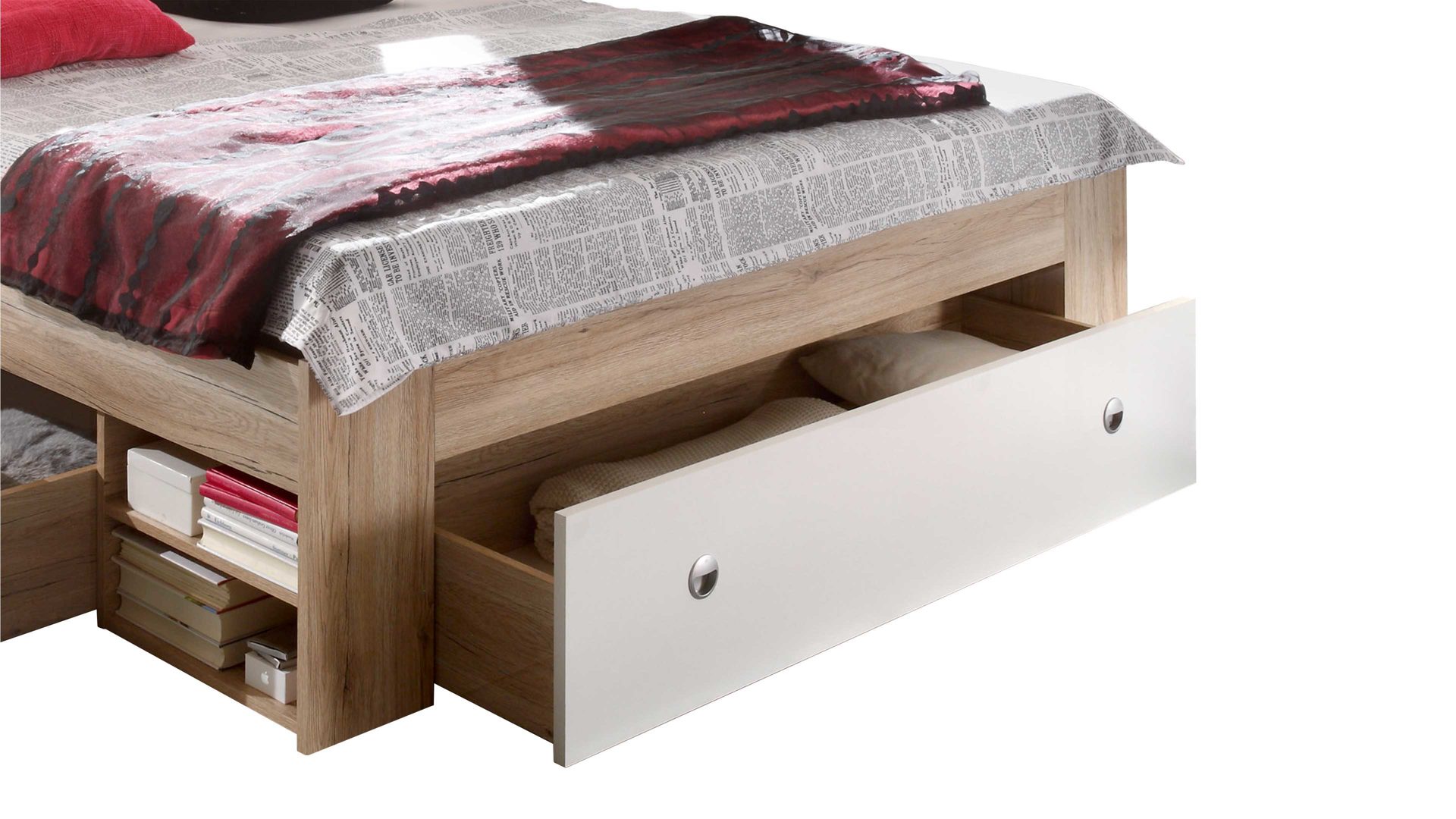 Apropos Griffe: Das Bettgestell ist mit drei Schubladen ausgestattet, in denen etwa Bettwäsche sowie Ersatz-Bettdecken und Ersatz-Kissen licht- und staubgeschützt Platz finden. Überdies beherbergt das Bett insgesamt vier offene Fächer - jeweils zwei auf der linken und rechten Bettseite. Das ist noch immer nicht alles, was dieses Bettgestell an Stauraum zu bieten hat: Es wird mit zwei Nachtkommoden geliefert, die je zwei offene Fächer mit sich bringen. Auch auf den Oberböden der Konsolen lassen sich diverse Gegenstände platzieren - beispielsweise eine Nachttischlampe und Taschentücher oder das Buch, das aktuell gelesen wird.