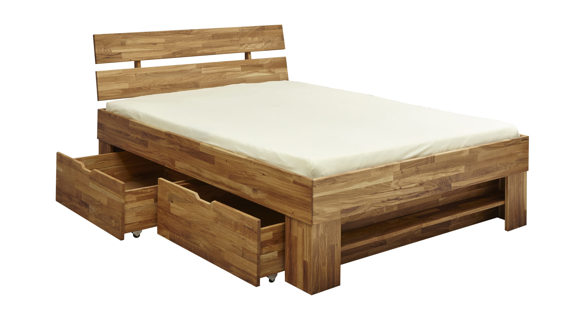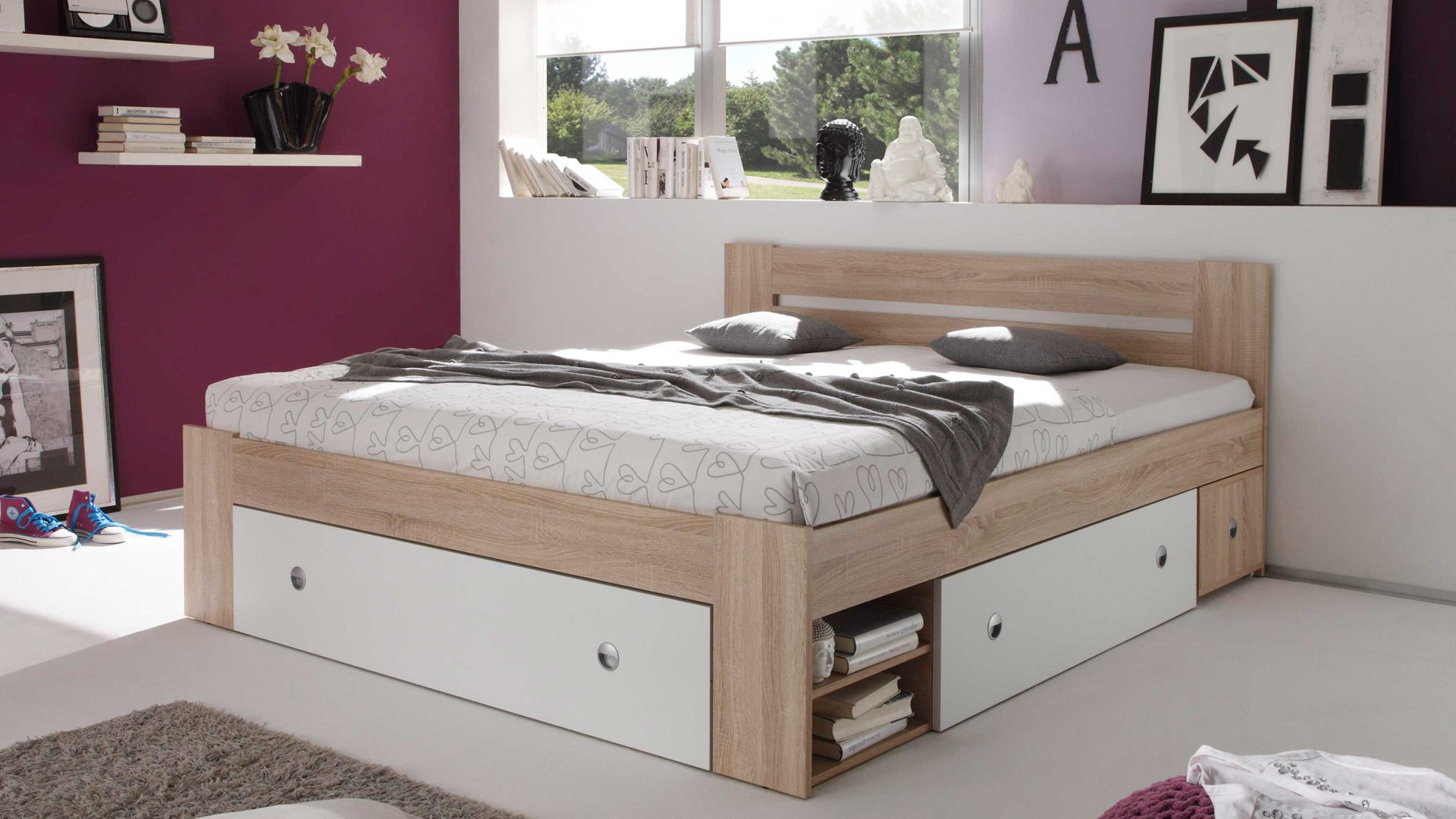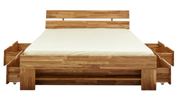Apropos Griffe: Das Bettgestell ist mit drei Schubladen ausgestattet, in denen etwa Bettwäsche sowie Ersatz-Bettdecken und Ersatz-Kissen licht- und staubgeschützt Platz finden. Überdies beherbergt das Bett insgesamt vier offene Fächer - jeweils zwei auf der linken und rechten Bettseite. Das ist noch immer nicht alles, was dieses Bettgestell an Stauraum zu bieten hat: Es wird mit zwei Nachtkommoden geliefert, die je zwei offene Fächer mit sich bringen. Auch auf den Oberböden der Konsolen lassen sich diverse Gegenstände platzieren - beispielsweise eine Nachttischlampe und Taschentücher oder das Buch, das aktuell gelesen wird.