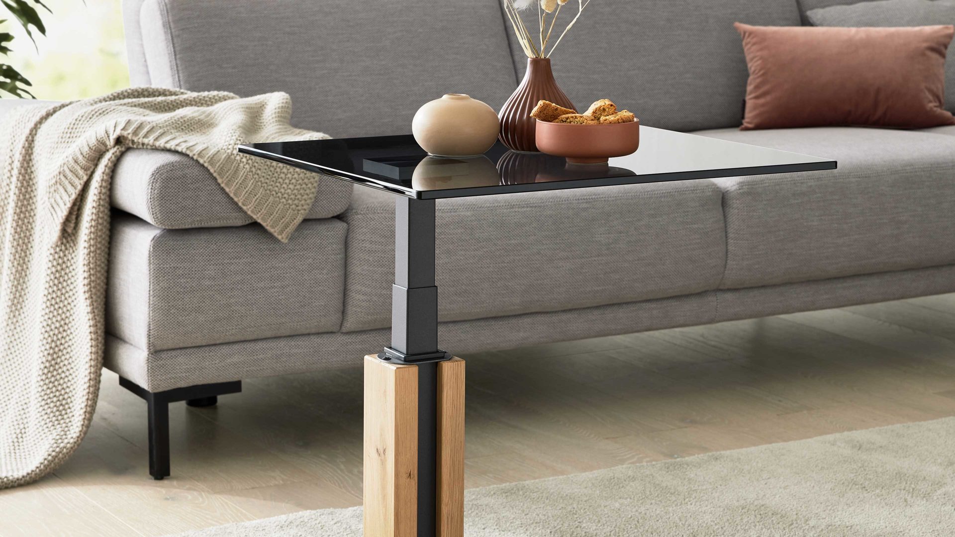 Mit Maßen von ca. 55 x 47–65 x 47 cm (BxHxT) ist der Tisch kompakt, vielseitig und harmoniert perfekt mit modernen Wohnumgebungen. Alternativ ist er auch mit einer perlsilberfarbenen Bodenplatte und einer Klarglas-Tischplatte erhältlich – für eine hellere, luftigere Raumwirkung.