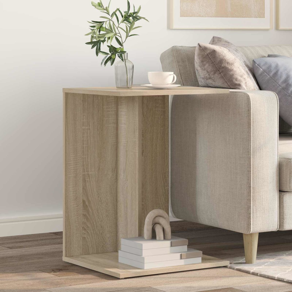 Dieser moderne Beistelltisch ist eine schicke und praktische Ergänzung für dein Zuhause. Sein elegantes Design mit klaren Linien und rechteckiger Form passt perfekt in jedes Wohnzimmer. Er ist ideal für kleine Räume und bietet Platz für Lampen, Getränke oder Deko – und fügt sich super in jeden modernen Stil ein. Egal, ob neben einem Sofa oder einem Sessel, alles Essentielle ist immer griffbereit. Materialien: Der Beistelltisch ist aus Holzwerkstoff, der robust ist und durch regelmäßige Nutzung nicht ansehnlich wird. Das sorgt für eine tolle Langlebigkeit und das schicke Aussehen bleibt erhalten. Holzwerkstoff wurde wegen seiner Stärke und dauerhaften Qualität ausgewählt und bietet eine super Kombination für Möbel im Innenbereich. Enthaltene Komponenten: Er hat einen stylischen Rücken, somit kannst du ihn überall im Raum einsetzen, ohne dir Gedanken über unschöne Kanten machen zu müssen. Egal ob an einer Wand oder freistehend, er sieht von jedem Blickwinkel toll aus. Merkmale / Funktion / Design: Der Tisch hat ein haltbares Design und bietet anhaltende Stärke und sieht dabei stylish aus. Er bietet eine solide Unterstützung für alles, was du draufstellen möchtest, und wertet den Raum echt auf. Sein moderner Stil passt super zu vielen verschiedenen Deko-Ideen. Empfohlene Anwendungen: Der Beistelltisch ist perfekt für deinen Wohnbereich. Er kann Lampen, Bücher, Getränke oder Deko tragen. Egal ob für Ordnung oder einfach für die Atmosphäre, er passt in viele Lebenssituationen und Vorlieben im Zuhause. Pflege & Wartung: Halte ihn schön, indem du bei der Reinigung keine scharfen Chemikalien und rauen Materialien verwendest. Die Montage macht man am besten zu zweit mit einem Schraubendreher. Befolge einfach die Anleitung des Herstellers, so sicherst du die Lebensdauer und Nützlichkeit des Tisches. ** Farbe: Sonoma-Eiche ** Material: Holzwerkstoff ** Gesamtabmessungen: 45 x 40 x 62,5 cm (L x B x H) ** Gewicht: 7 kg ** Langlebig ** Rahmenmaterial: Holzwerkstoff ** Nur für den Innenbereich ** Lieferumfang: ** 1 x beistelltisch ** Montage erforderlich: Ja