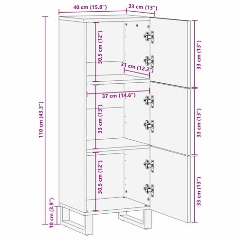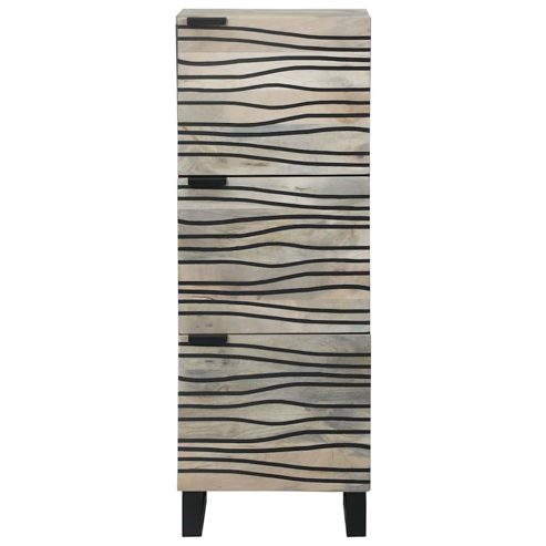 Dieses rustikale Hochboard ist ein stylisches Möbelstück für jedes Wohnzimmer. Mit seiner rechteckigen Form und dem schönen Wellenmuster kombiniert es Stauraum mit schicker Optik und ist ein echter Hingucker in deinem Zuhause. Materialien: Das Hochboard ist aus stabilem, massivem Mangoholz gefertigt, das für seine Langlebigkeit und sein zeitloses Aussehen bekannt ist. Der robuste Holzbau sorgt dafür, dass es lange gut aussieht. Enthaltene Komponenten: Mit klaren Regalen, die die Organisation leicht machen, hat dieses Hochboard Türen mit Scharnieren für einfachen Zugang zu deinen Sachen. Jedes Regal kann eine Vielzahl von Gegenständen problemlos halten, was die Organisation super einfach macht. Eigenschaften / Funktion / Design: Das Hochboard bietet viel Stauraum und hält deinen Raum ordentlich. Seine rechteckige Form ist vielseitig und passt perfekt in jedes Wohnzimmer und bietet eine stylische Fläche für deine Deko. Empfohlene Anwendungen: Diese Aufbewahrungseinheit macht dein Wohnzimmer funktionaler und fungiert als zentraler Punkt oder Hintergrund für verschiedene Anlässe. Egal, ob du Freunde einlädst oder einen gemütlichen Abend zu Hause verbringst, es ist immer praktisch und anpassungsfähig für unterschiedliche Einsätze. Pflege & Wartung: Damit es immer schick aussieht, einfach mit den bereitgestellten Werkzeugen zusammenbauen und regelmäßig mit einem weichen, trockenen Tuch abstauben. Die Montageanleitung des Herstellers zu befolgen hilft, es sicher und hygienisch zu halten und die Lebensdauer des Hochboards zu verlängern. ** Farbe: Weiß und schwarz ** Material: Massives mangoholz mit eisenrohren und engineered wood ** Gesamtabmessungen: 40 x 33.5 x 110 cm (L x B x H) ** Mit 3 türen ** Versammlung erforderlich: Ja ** Lieferung: ** 1 x Hochboard