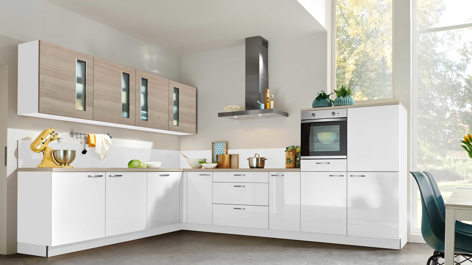 Die nolte® Einbauküche Lux mit privileg-Einbaugeräten kombiniert arcticweiße Lacklaminat-Hochglanzfronten mit natürlich anmutender Vulkaneiche-Nachbildung.