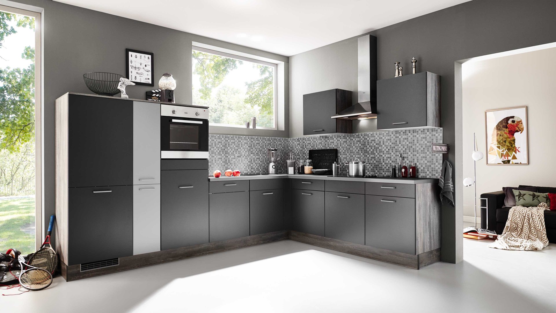 Die Fronten dieser pino Einbauküche sind vorrangig in Grafit designt, kombiniert mit Platingrau. Einen gelungenen Akzent setzen die Korpusseiten und Sockelblenden in Steineiche-Nachbildung. Die Arbeitsplatten präsentieren sich ebenfalls platingrau und steineichefarben. Schlichte Bügelgriffe runden die modern-elegante Optik stilvoll ab.
