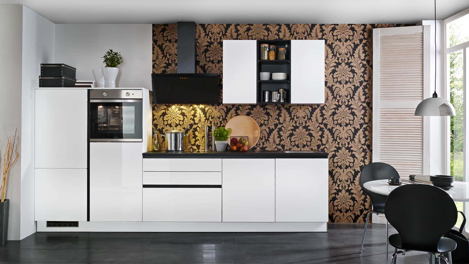 Die EXPRESS KÜCHEN Einbauküche Star mit privileg Geräten kombiniert weiße Hochglanzfronten mit klassischem Schwarz. Einen attraktiven Akzent setzt die Arbeitsplatte in wiederum schwarzer Steinstruktur-Nachbildung. Dunkle Griffleisten runden die moderne und elegante Optik der Planküche stilsicher ab.