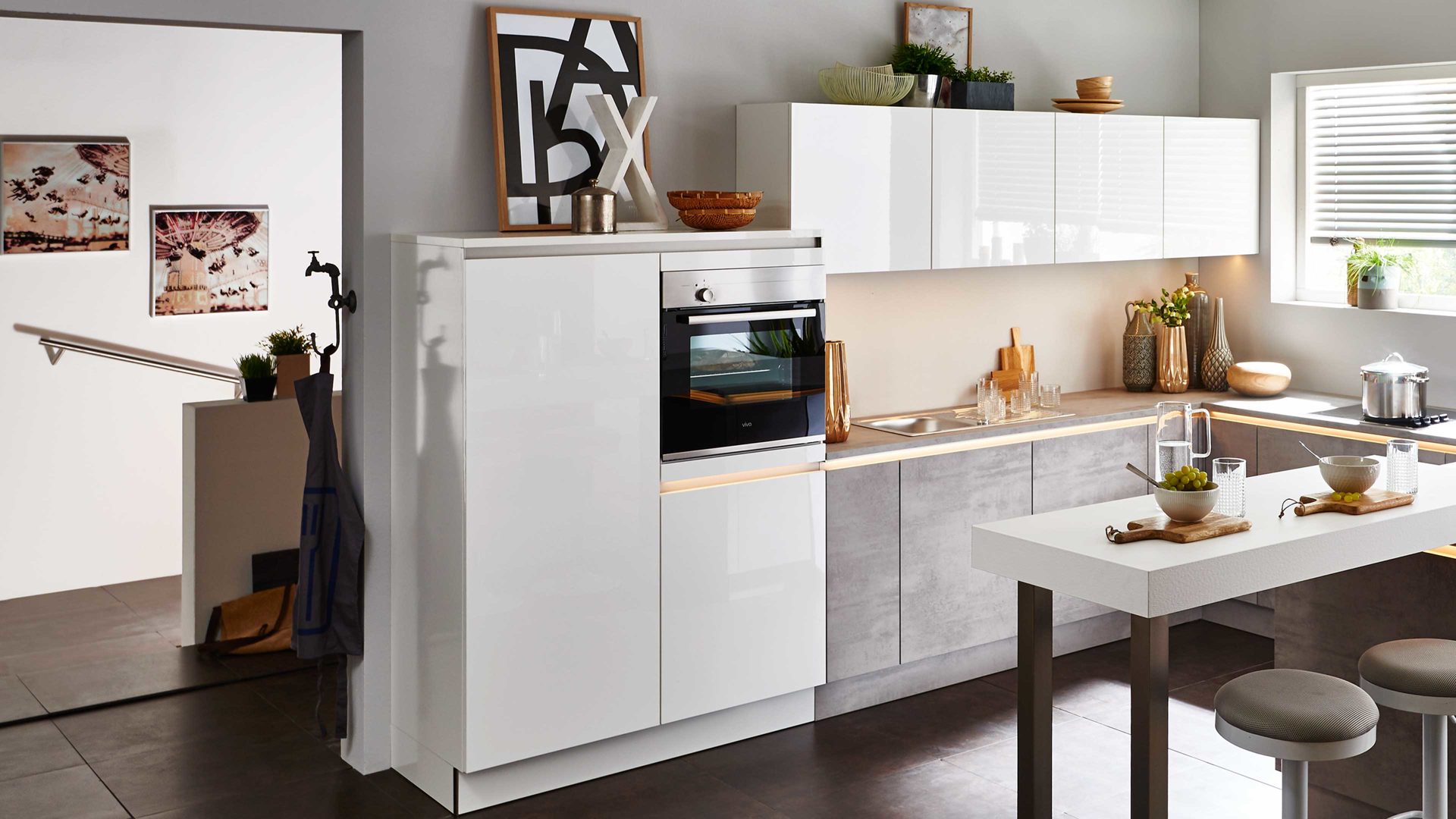 Die nolte® Einbauküche Lux mit privileg Einbaugeräten ist modern designt. Sie kombiniert puristisch weiße Hochglanzfronten mit trendiger Beton-Nachbildung. Durch die hellen, perfekt aufeinander abgestimmten Farben wirkt die Planküche besonders freundlich und einladend sowie elegant.