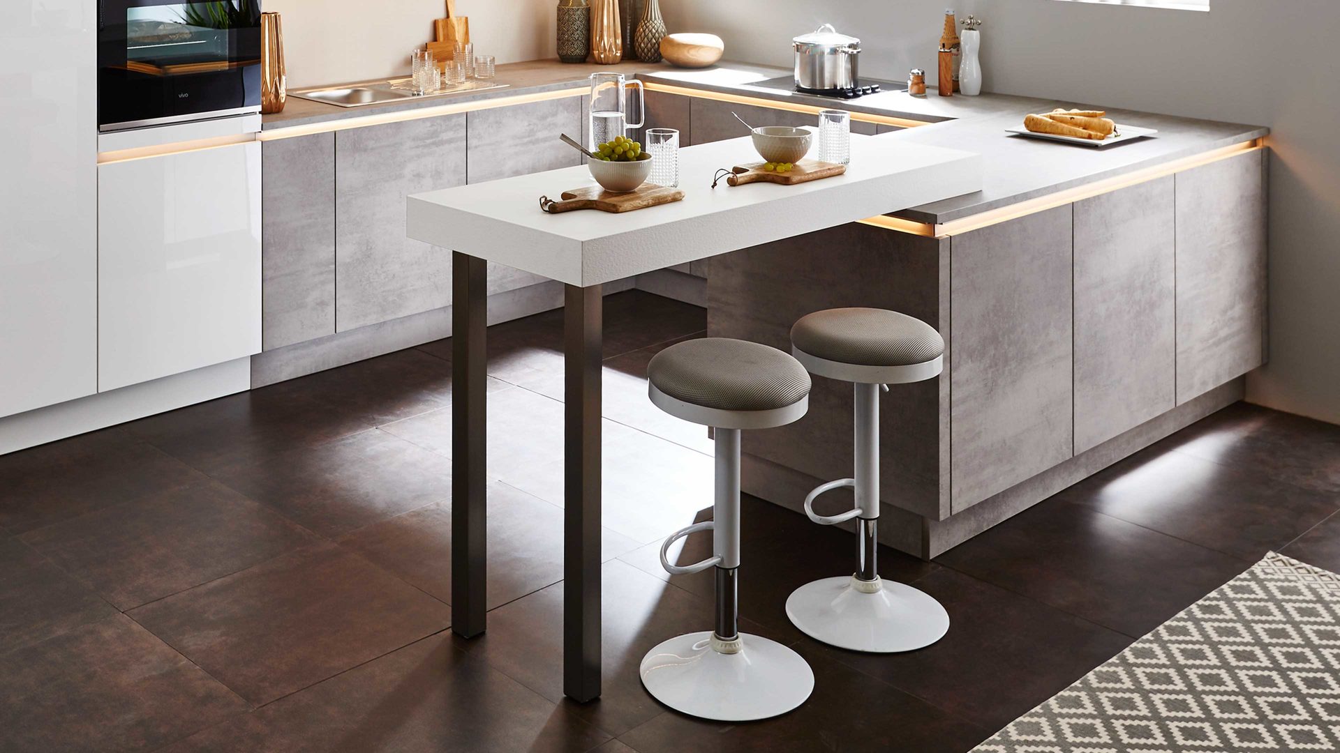 Passend zu den Fronten präsentieren sich die Korpusse und Sockelblenden in Premiumweiß und betonfarben. Ebenfalls in Beton-Nachbildung sind die Arbeitsplatten gestaltet, während die Sichtseiten und der Ansetztresen noch einmal den premiumweißen Ton aufgreifen.