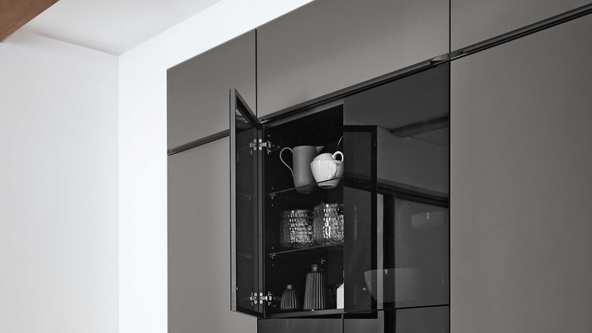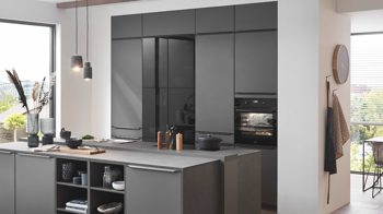 Die nobilia® Einbauküche Laser kombiniert mattes Vulkangrau als absolute Trendfarbe mit attraktiven Akzenten aus Schwarzglas.