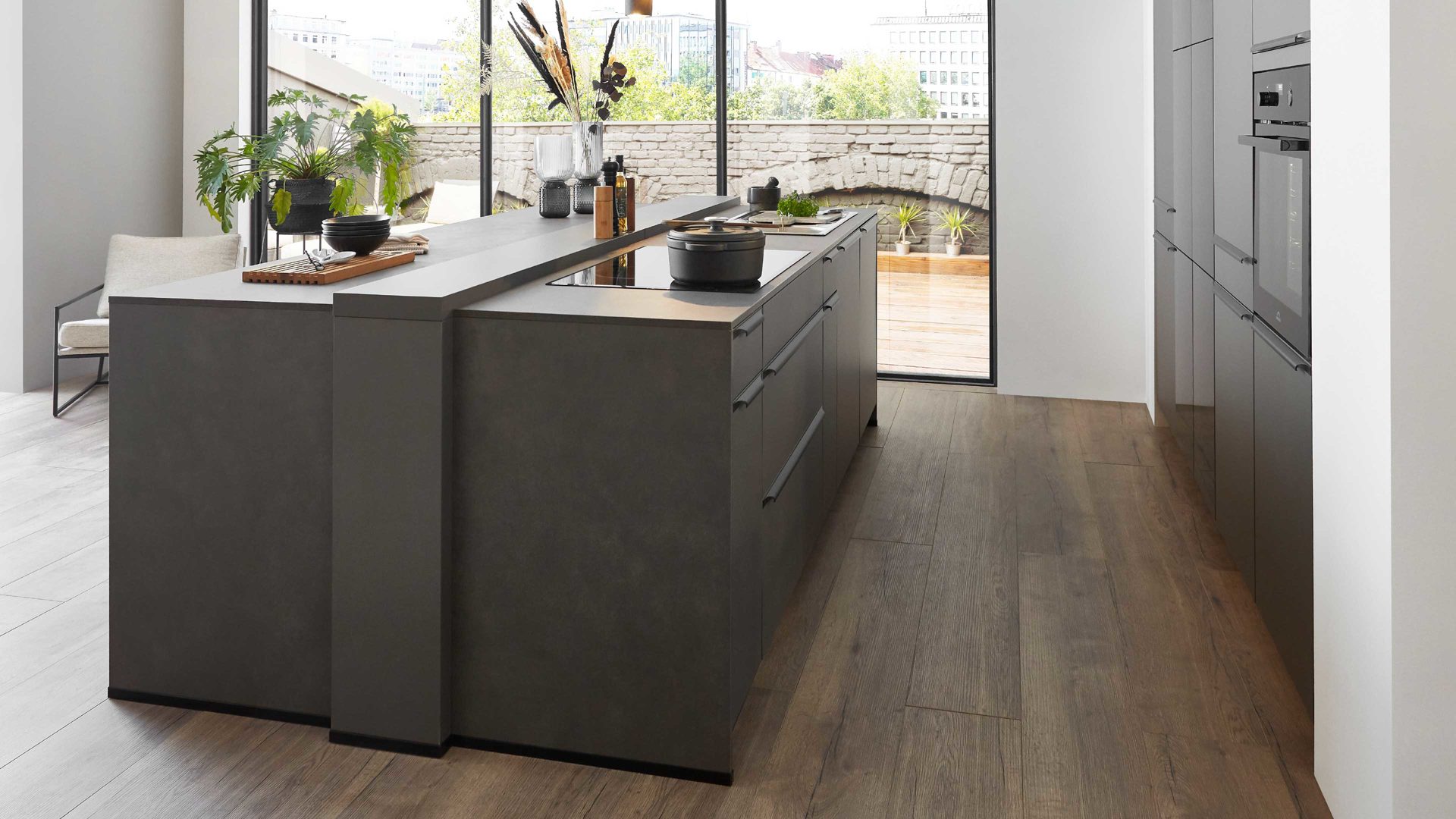 Griffleisten und Arbeitsplatten in terragrauer Beton-Nachbildung runden das stilvolle Design harmonisch ab.