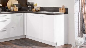 weiße Hochglanz-Lacklaminatfronten und schwarze Arbeitsplatten