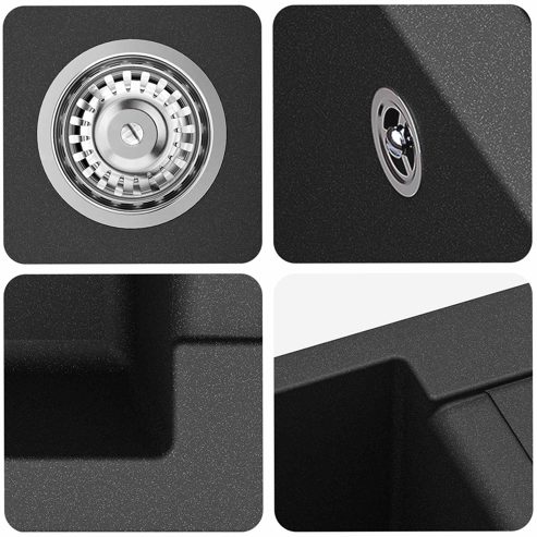 Dieses moderne Küchenspülbecken ist eine tolle Ergänzung, die schicke Eleganz mit super Funktionalität verbindet. Seine rechteckige Form fügt sich perfekt in moderne Küchen ein und verleiht jedem Raum einen eleganten Touch. Durch die robusten Materialien aus 80 % Quarz und 20 % Harz ist es nicht nur stylisch, sondern auch für den täglichen Gebrauch geeignet. Die klaren Linien und das schicke Design machen es ideal für Hobbyköche und Familien, die oft in der Küche sind. Materialien: Das Becken besteht aus einer genauen Mischung aus 80 % Quarz und 20 % Harz. Diese Kombination macht es stark und widerstandsfähig. So sieht es auch bei häufigem Gebrauch in der Küche immer gut aus. Enthaltene Komponenten: Ein Korb-Sieb-Abflussset ist im Lieferumfang enthalten, das die Entsorgung von Abfällen erleichtert. Damit bleibt der Abfluss frei und die Reinigung geht schnell von der Hand. Funktionale Merkmale: Das Becken ist oben montiert, was die Installation in verschiedenen Arbeitsplatten einfach macht. Es hält Temperaturen bis 280 °C stand, also keine Sorge bei heißen Töpfen oder kochendem Wasser. Die kratz- und fleckenresistente Oberfläche sorgt für eine lange Lebensdauer und einfache Pflege. Empfohlene Verwendung: Mit seinem modernen Aussehen passt dieses Becken perfekt zu zeitgenössischen Küchen. Egal ob in einem schickem Apartment oder einer lebhaften Familienküche, sein Design ist vielseitig und praktisch. Es eignet sich hervorragend zum Reinigen, Vorbereiten und Abwaschen von Geschirr. Pflege & Wartung: Um die besten Ergebnisse zu erzielen, reinigen Sie das Becken regelmäßig mit sanften Reinigungsmitteln. Vermeiden Sie starke Chemikalien, um die Oberfläche zu schonen. Einfache Pflege sorgt dafür, dass das Becken lange schön bleibt. ** Farbe: Schwarz ** Material: 80% Quarz und 20% Harz ** Gesamtabmessungen: 780 x 500 mm (L x B) ** Gewicht: 15 kg ** Oben montiert ** Hitze beständig bis 280 °C ** Flecken- und kratzfest ** Abfallkorbgitter ist enthalten für einfache Beseitigung von Ablagerungen ** Lieferumfang: ** 1 x Spüle ** 1 x Zubehörset ** 1 x Abflussfilter ** Montage erforderlich: Ja