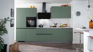 Ein besonderes Highlight ist die salbeigrüne Hängeschranklösung, die als stilvolles Sideboard gestaltet ist. Mit einer Breite von ca. 240 cm bietet sie zusätzlichen Stauraum und fügt sich harmonisch in den Wohnbereich ein. Der passende Abdeckboden in Salbeigrün rundet das Design elegant ab und verstärkt den wohnlichen Charakter der Küche.