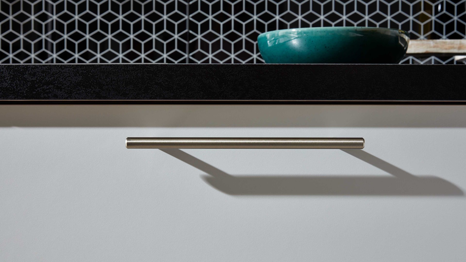 Die Kombination aus hellen und dunklen Elementen schafft ein ausgewogenes Gesamtbild mit klarer Designsprache. Edelstahl-Stangengriffe setzen dabei dezente, funktionale Akzente und runden das Erscheinungsbild stilvoll ab.