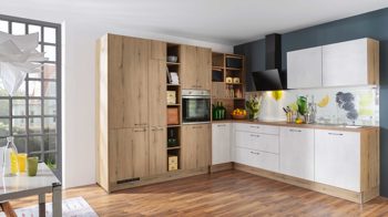 Hinzu kommt eine hochwertige Edelstahl-Einbauspüle. Optional können Sie die Küche Made in Germany auch mit einem praktischen Geschirrspüler erweitern.