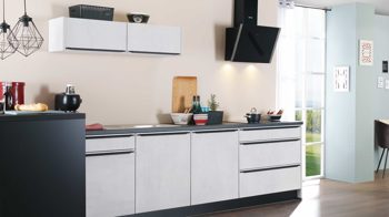 Die dreizeilige EXPRESS KÜCHEN Einbauküche Base mit Einbaugeräten kombiniert matte steinweiße Beton-Nachbildung mit Arbeitsplatten, Sockelblenden und einem Ansetztisch in puristischem Schwarz. Schlichte, ebenfalls schwarze Griffleisten runden den modernen und eleganten Look der Planküche stilsicher ab.