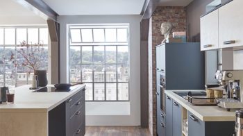 Die nobilia® Einbauküche Easytouch kombiniert ultramattes Fjordblau mit der Extravaganz von matter Weißbeton-Nachbildung.