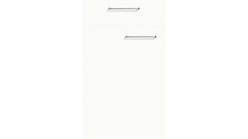 mattweiße Lacklaminatfronten, kombiniert mit dunkler Stahl-Nachbildung und Edelstahl-Bügelgriffen
