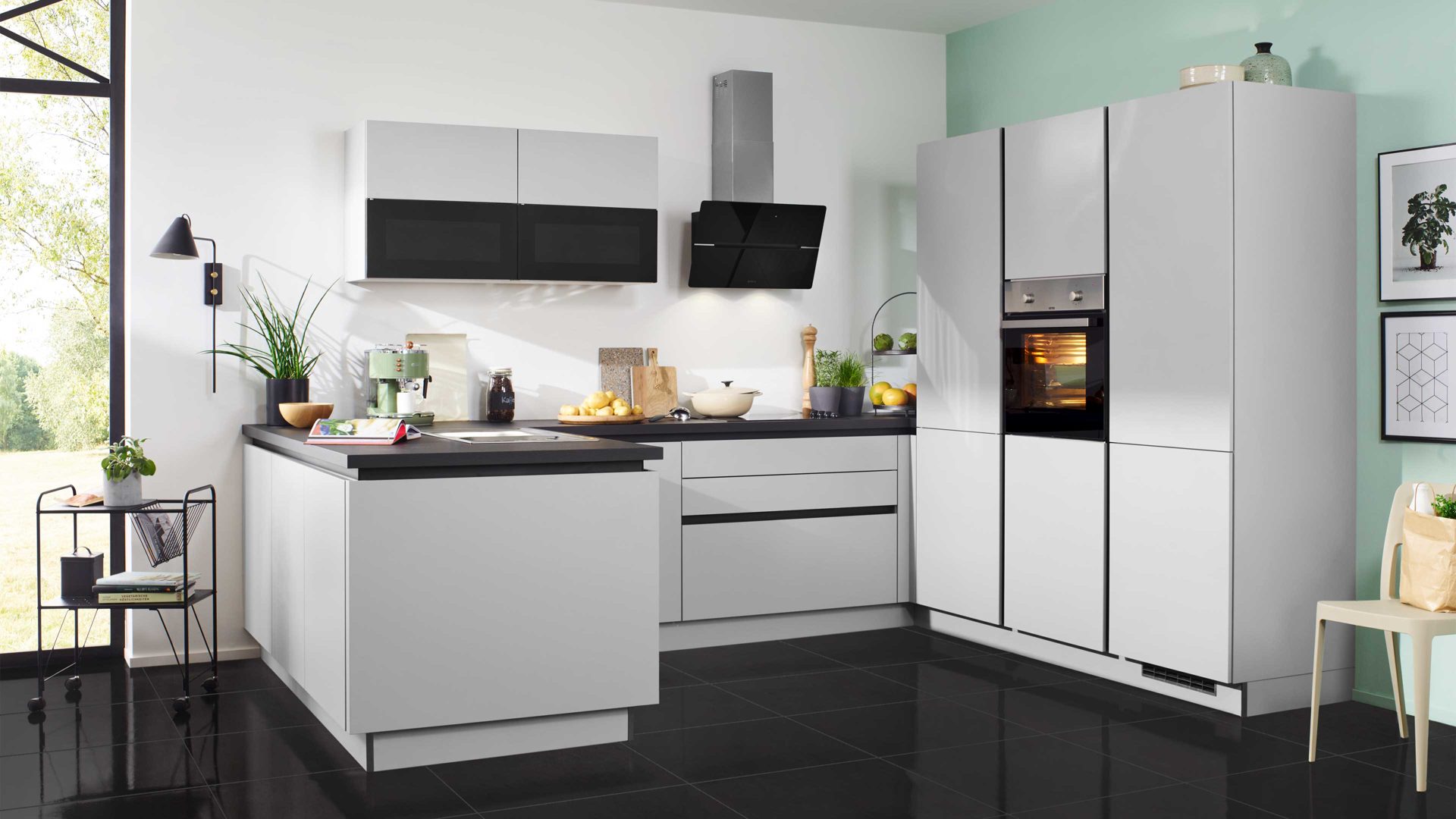 Stauraumschrank, hochgebauter Backofen und vollintegrierter Kühlschrank