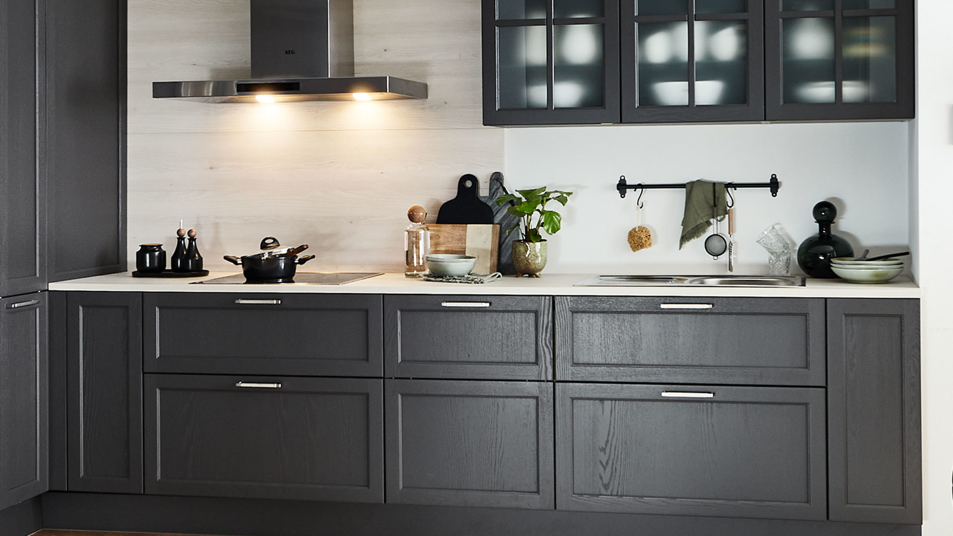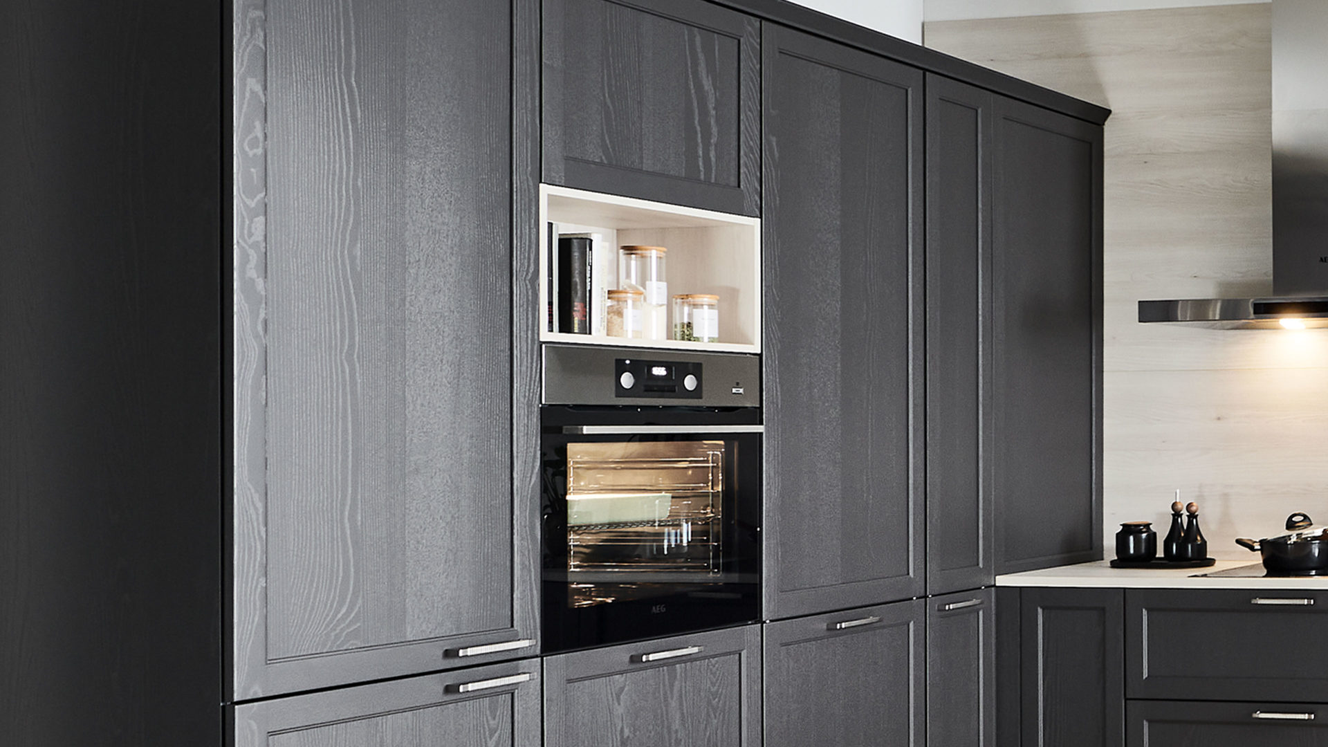 Diese Einbauküche im modernen Landhausstil verbindet klassische Formensprache mit zeitgemäßer Funktionalität. Softmatt graphitfarben lackierte Eschenholzfronten mit sichtbarer Maserung verleihen der Küche eine besonders edle Ausstrahlung. Der Massivholzrahmen mit furnierter Füllung unterstreicht die hochwertige Verarbeitung, während edelstahlfarbene Metallgriffe stilvolle Akzente setzen. Arbeitsplatte und Regalfach in Kiruna Birke-Nachbildung sorgen für eine warme, natürliche Ergänzung.