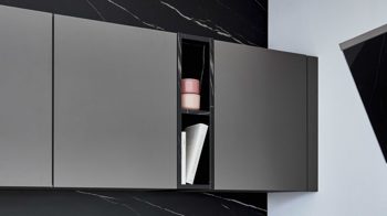 Die nobilia® Einbauküche Laser überzeugt mit mattem Taupegrau und integrierten dunkelgrauen Griffmulden, die das reduzierte Design unterstreichen. Arbeitsplatten und Nischenverkleidung in Venato Nero Marmor-Nachbildung setzen einen ausdrucksstarken Akzent und verleihen der Küche eine edle, moderne Note.