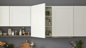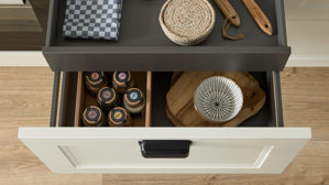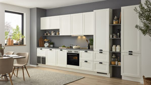 Culineo® Einbauküche C684 mit Einbaugeräten – moderner Landhausstil in Mattweiß und Schiefergrau