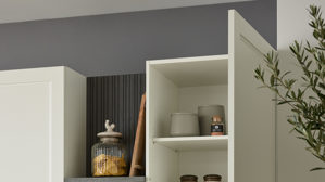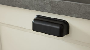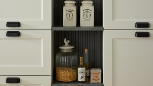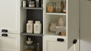 Die Culineo® Einbauküche C684 verbindet den gemütlichen Charme eines Landhausstils mit klarer, moderner Linienführung. Mattweißes Lacklaminat, kombiniert mit schiefergrauem Stripewood und schwarzen Muschelgriffen, sorgt für eine stilvolle, kontrastreiche Optik. Die Arbeitsplatten und Regalböden im Grauton Caledonia sowie mattweiße Sockelblenden verleihen der Küche ein harmonisches, helles Gesamtbild mit natürlicher Wärme.
