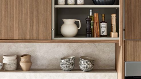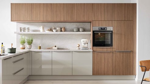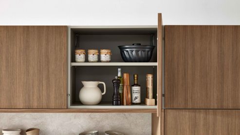 Hänge- und Hochschränke schaffen viel Platz für Vorräte, Geschirr und Küchenhelfer und integrieren gleichzeitig die wichtigsten Elektrogeräte harmonisch in das Gesamtbild. Ein langer Regalboden sorgt für offene Abstellfläche und lockert das Design optisch auf.
