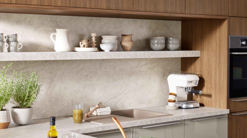 Die WERT KÜCHE® Linda vereint modernes Küchendesign mit wohnlicher Natürlichkeit. Matte kieselgraue Fronten treffen auf Elemente in dunkler Eiche-Nachbildung mit Rillenoptik, die der Küche eine besondere Tiefe und Struktur verleihen. Edelstahlfarbene Griffleisten unterstreichen die klare Linienführung, während Arbeitsplatten und Nischenverkleidung in beiger Sandstein-Nachbildung für eine helle, freundliche Atmosphäre sorgen.