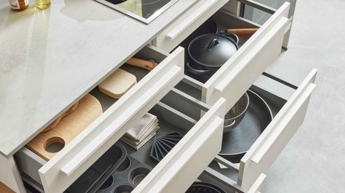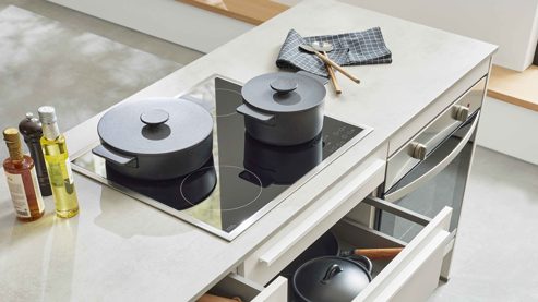 Die linke Kücheninsel mit einer Länge von ca. 183 cm ist der zentrale Arbeitsbereich dieser Küche. Sie bietet großzügige Arbeitsflächen, praktische Auszugschränke und integriert das privileg Glaskeramik-Kochfeld PCTHRK6040IN mit einer Breite von ca. 60 cm.