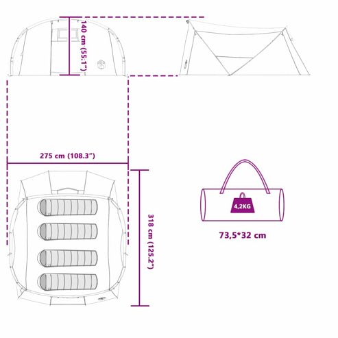Dieses moderne Tunnelzelt bringt frischen Wind ins Camping. Hier trifft stylisches Design auf praktische Funktionalität. Perfekt für Camper, die Minimalismus lieben, aber auf Komfort nicht verzichten wollen. Es bietet Platz für Familie und Freunde und sorgt für unvergessliche Erlebnisse unter dem Sternenhimmel. Die klaren Linien und coolen Details machen es ansprechend und einladend. Egal ob für ruhige Rückzugsorte oder lebhafte Camping-Abenteuer, es ist für jede Jahreszeit geeignet. Hochwertige Materialien: Hergestellt aus strapazierfähigem 185T Polyester mit PU-Beschichtung, hält dieses Zelt dem Wasser stand. Ideal für Regenfälle in Südostasien, europäische Nieselregen oder unvorhergesehene Regengüsse. Es schützt auch vor UV-Strahlung und sieht dabei auch nach längerer Nutzung noch prima aus. Einfacher Aufbau: Mit einem praktischen Reißverschluss ist das Zelt schnell aufzubauen und abzubauen. Eine innere Aufbewahrungstasche sorgt dafür, dass alles immer griffbereit ist. Die Abspannleinen und Erdspieße geben extra Stabilität, gerade bei windigem Wetter. Praktische Features: Ausgestattet mit einem Belüftungsfenster und einem praktischen E-Port, kannst du einfach Strom anschließen. Du kannst schnell auf- und abbauen, um Zeit beim Campen zu sparen. Der Haken für Lampen sorgt für gute Sicht und eine einladende Atmosphäre. Saisonale Flexibilität: Egal ob beim geschäftigen Sommer-Camping oder bei entspannten Wochenendausflügen – das anpassbare Design macht es einfach, in unterschiedlichen Klimazonen zu nutzen. Die schöne Optik fügt sich toll in Gärten oder auf Terrassen ein. Leicht zu reinigen: Halte das Zelt einfach mit einem feuchten Tuch sauber – es erfordert kaum Pflege und bleibt dabei schick. Diese unkomplizierte Reinigung zeigt, dass Bequemlichkeit und Langlebigkeit wichtig für das Design waren. ** Farbe: Grün und Weiß ** Material: 185T Polyester mit PU-Beschichtung ** Gesamtabmessungen: 318 x 275 x 140 cm (L x B x H) ** Gewicht: 4,2 kg ** Wasserfeste Materialien ** UV-beständige Materialien ** Belüftungsfenster ** Praktischer E-Port ** Integrierter Licht-Haken ** Innentasche ** Schneller Abbau für kompakte Lagerung ** Abspannleinen für zusätzliche Festigkeit ** Erdanker für zusätzliche Stabilität ** Tragetasche für einfachen Transport ** mit Tragetasche ** mit Luftentlüftung ** Innen- / Außenbereich: Nur für den Außenbereich ** Lieferumfang: ** 1 x Zeltdach ** 1 x Set von Stangen ** 4 x Abspannleine ** 14 x Erdnagel ** 1 x Tragetasche ** Montage erforderlich: Ja Achtung Halten Sie alle Flammen und Wärmequellen von diesem Produktgewebe fern.