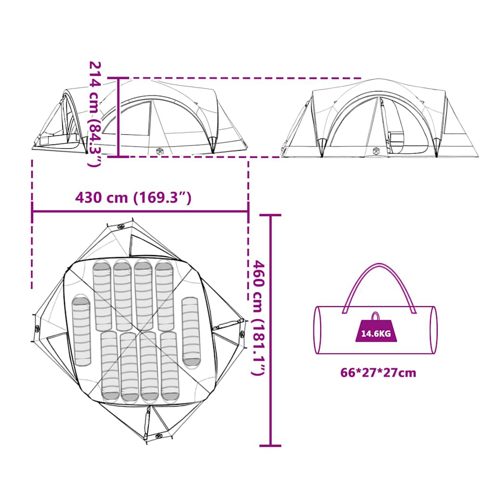 Dieses Familienzelt für Camping hat ein großzügiges Dach, das Funktionalität und Stil für Outdoor-Fans vereint. Mit seinem modernen Design, das klare Linien und minimalistische Details bietet, passt es perfekt in jede Camping-Umgebung. Es ist geräumig und ideal für Familien oder Gruppen, die die Natur erleben möchten. Seine markante Silhouette und praktische Eigenschaften garantieren geschützte Nächte unter den Sternen und schaffen Erinnerungen an Abenteuer und Naturverbundenheit. 185T Polyester mit PU-Beschichtung Hergestellt aus 185T Polyester mit schützender PU-Beschichtung, bietet dieses Zelt Haltbarkeit und Widerstandsfähigkeit gegen unterschiedliche Wetterbedingungen. Das Taftgewebe sorgt für zuverlässigen Schutz bei unerwarteten Sommerstürmen und hält Camper vor Regen und Wind geschützt, während eine angenehme Luftzirkulation im Inneren erhalten bleibt. Diese robusten Materialien verlängern die Lebensdauer für viele saisonale Abenteuer. Komplettes Camping-Setup Dein Set enthält ein Zelt, einen abnehmbaren Regenschutz, ein stabiles Stangenset, eine praktische Tragetasche, Abspannleinen für extra Stabilität und Erdnägel zum Festigen. Jedes Teil funktioniert perfekt zusammen, um dir ein stressfreies Campingerlebnis zu bieten und schnelles Auf- und Abbauen zu gewährleisten. Funktionale Merkmale Es bietet praktische Features wie eine geräumige Innenstauraumtasche und einen integrierten Licht-Haken, mit dem du deine Campingaktivitäten organisieren und beleuchten kannst. Die Belüftungsfenster sorgen für angenehme Luftzirkulation, während der E-Port dir erlaubt, Geräte bequem mit Strom zu versorgen. Vielseitigkeit für den Außenbereich Egal ob im Garten, auf Terrassen oder Campingplätzen, seine Portabilität macht es anpassungsfähig für verschiedene Outdoor-Umgebungen. UV-beständige und wetterfeste Materialien garantieren dazu die Leistung und schützen alle Insassen, egal ob der Himmel klar oder bewölkt ist. Einfache Reinigungsanweisungen Wische das Zelt nach dem Gebrauch mit einem feuchten Tuch ab, um sein Aussehen zu bewahren und die Haltbarkeit zu erhöhen. Achte darauf, dass Wasser und Schmutz entfernt werden, um Materialabbau zu vermeiden. Der Aufbau erfordert zwei Personen, die die enthaltenen Anker benutzen. ** Farbe: Blau und Grau ** Material: 185T Polyester mit PU-Beschichtung ** Gesamtabmessungen: 460 x 430 x 214 cm (L x B x H) ** Gewicht: 14,6 kg ** Wasserfeste Materialien ** UV-beständige Materialien ** Belüftungsfenster ** Praktischer E-Port ** Integrierter Licht-Haken ** Innentasche ** Abnehmbarer Regenfly ** Schneller Abbau für kompakte Lagerung ** Abspannleinen für zusätzliche Festigkeit ** Erdanker für zusätzliche Stabilität ** Tragetasche für einfachen Transport ** mit Tragetasche ** mit Luftentlüftung ** Innen- / Außenbereich: Nur für den Außenbereich ** Lieferumfang: ** 1 x Zeltplane ** 1 x Abnehmbare Regenhaube ** 1 x Set mit Stangen ** 4 x Abspannleinen ** 16 x Erdnägel ** 1 x Tragetasche ** Montage erforderlich: Ja Achtung Halten Sie alle Flammen und Wärmequellen von diesem Produktgewebe fern.