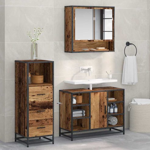 Dieses coole Set aus Holz Badezimmermöbeln ist genau das, was du brauchst, um deinem Bad einen frischen Look zu geben. Mit cleanen Linien und einem minimalistischen Stil sieht es überall toll aus. Egal, ob du deine Pflegeroutine organisieren oder alles ordentlich verstauen willst, dieses Set hat eine schicke Oberfläche und eine praktische Form, um das Beste aus kleinen Räumen zu holen. So wirst du ein Bad schaffen, das sowohl sortiert als auch hübsch ist. Material: Aus hochwertigem Holzwerkstoff sind die Oberflächen des Sets robust und leicht zu reinigen. Der Holzwerkstoff hat eine glatte Oberfläche und verzieht sich nicht, was ihn perfekt für feuchte Badezimmer macht. Der Metallrahmen bringt einen stylischen Touch und gibt stabilen Halt für all deine Kleinigkeiten. Inklusive Komponenten: Das Set enthält alles, was du brauchst: einen Spiegelschrank, einen Waschtischschrank und einen zusätzlichen Stauraumschrank. Jedes Stück bietet viel Platz, während es einheitlich aussieht. Der Spiegelschrank macht alles noch funktionaler und sorgt für klare Reflexionen bei deiner täglichen Pflege. Stauraumfunktionen: Mit vielen Fächern, Schubladen und Regalen hat dein ganzes Badezimmerzeug seinen Platz, was das Durcheinander reduziert und alles leicht zugänglich macht. Diese Anordnung sorgt dafür, dass deine Toilettenartikel, Kosmetika und Handtücher ordentlich und sauber bleiben, für ein super effizientes Badezimmer. Empfohlene Verwendungen: Top für kleine bis mittelgroße Badezimmer, nutzt dieses Set deinen Platz optimal aus und verleiht deinem Dekor einen schicken Touch. Es passt gut zu verschiedenen Stilrichtungen, was es perfekt für Familien- oder Gemeinschaftsbäder macht. Pflege & Wartung: Halte dein Badezimmermöbel frisch, indem du es einfach mit einem feuchten Tuch abwischt, wenn nötig. Ein bisschen regelmäßige Reinigung hilft, die Lebensdauer zu verlängern und lässt dein Bad schick aussehen. ** Farbe: Altholz ** Material: Holzwerkstoff ** Gesamtabmessungen: 80 x 33 x 60 cm (L x B x H) ** Gewicht: 61.21 kg ** Stauraum ** Mit Schublade ** Mit flachspiegel spiegel ** Rahmenmaterial: Metall ** Mit 3 türen ** Innen- / außenbereich: Nur für drinnen ** Lieferumfang: ** 1 x Spiegelschrank für's Bad ** 1 x Waschschrank für's Bad ** 1 x Badezimmerschrank. ** Anzahl artikel: 3 ** Montage erforderlich: Ja