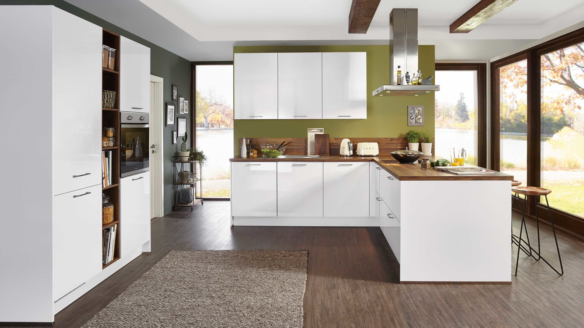 Dank der Vielzahl an Schränken mit Türen und Schubladen sowie der offenen Regalbereiche mit schicken Glaseinsätzen bietet die Einbauküche jede Menge Stauraum für Geschirr und Lebensmittel sowie diverse Küchenutensilien.