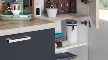 Sie kombiniert schiefergraue Lacklaminat-Hochglanzfronten mit Montreal-Eiche-Nachbildung. Auch der Korpus sowie die Arbeitsplatten und Sockelblenden sind im natürlich anmutenden Eicheton gestaltet.