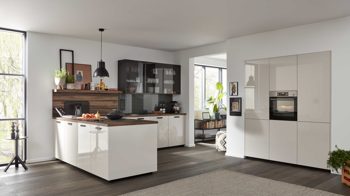 Die nolte® Einbauküche Lux mit Constructa Einbaugeräten kombiniert den puristischen Look arcticweißer Hochglanzfronten mit dem warmen Charme von rustikaler Wildeiche-Nachbildung. Durch die hellen, perfekt aufeinander abgestimmten Farben wirkt die Küche besonders freundlich und einladend. Sie strahlt Eleganz aus und bringt ein natürliches Ambiente in den Raum.