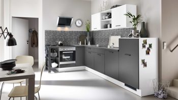 Die Stellfläche beziehungsweise das Schenkelmaß der Planküche beläuft sich auf ca. 335 x 246 cm (BxL, von links nach rechts). In den verschiedenen Schränken und Auszügen haben Sie jede Menge Stauraum für die wichtigsten Küchenutensilien.