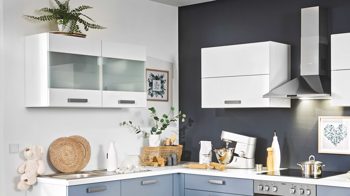Als Höhepunkt der individuell planbaren Einbauküche fungieren die Hängeschränke mit Glasfronten und Faltklapptüren. Optional können Sie eine Armatur für die Einbauspüle und eine Geschirrspülmaschine für eine bequemere Geschirrreinigung ergänzen. Die hochwertige Systemküche ist Made in Germany.