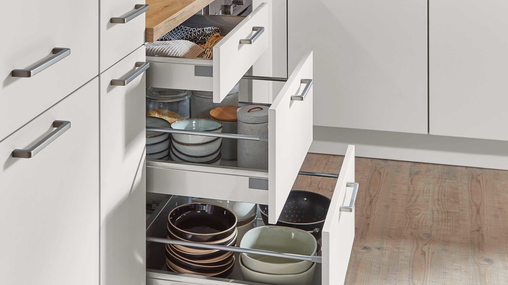 Seidengrau, kombiniert mit Eiche Sierra-Nachbildung und edelstahlfarbenen Metallgriffen