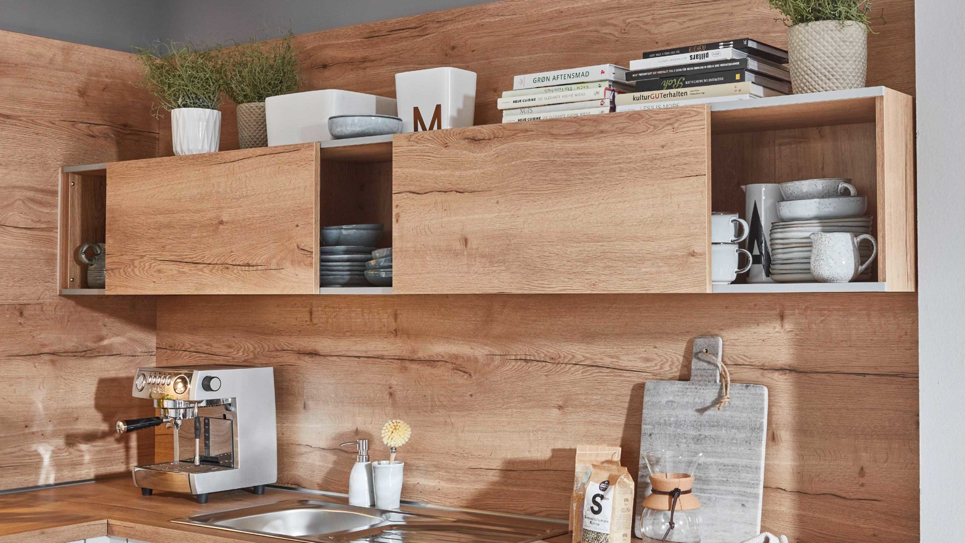 rechts Hängeschränke mit Schiebetüren und hochwertiger Einbauspüle