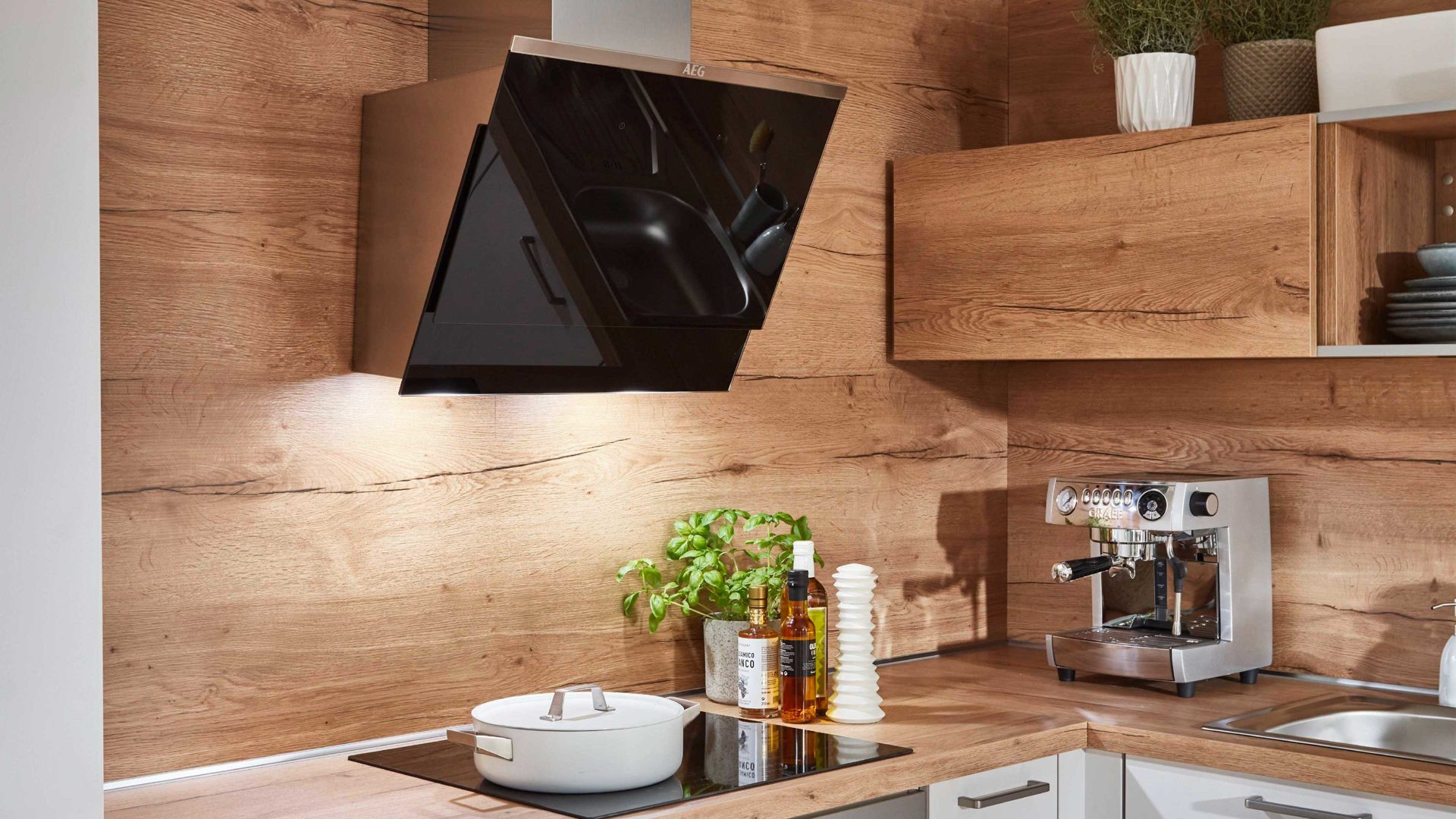 links mit hohem Apothekerschrank und kopffreier Abzughaube