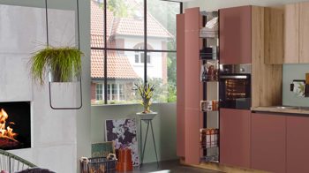 Hinzu kommt eine hochwertige Edelstahl-Einbauspüle. Optional können Sie die Küche Made in Germany auch mit einem praktischen Geschirrspüler erweitern. Das individuell planbare Küchenprogramm trägt das Goldene M.