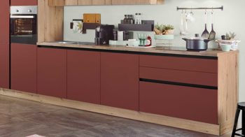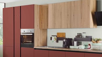 Die EXPRESS KÜCHEN Einbauküche Win mit Einbaugeräten kombiniert mattes Karminrot mit astiger Eiche-Nachbildung - Farben, die perfekt miteinander harmonieren und für eine warme und einladende Ausstrahlung sorgen. Schwarze Griffspuren runden die moderne und elegante Optik der Planküche stilsicher ab.
