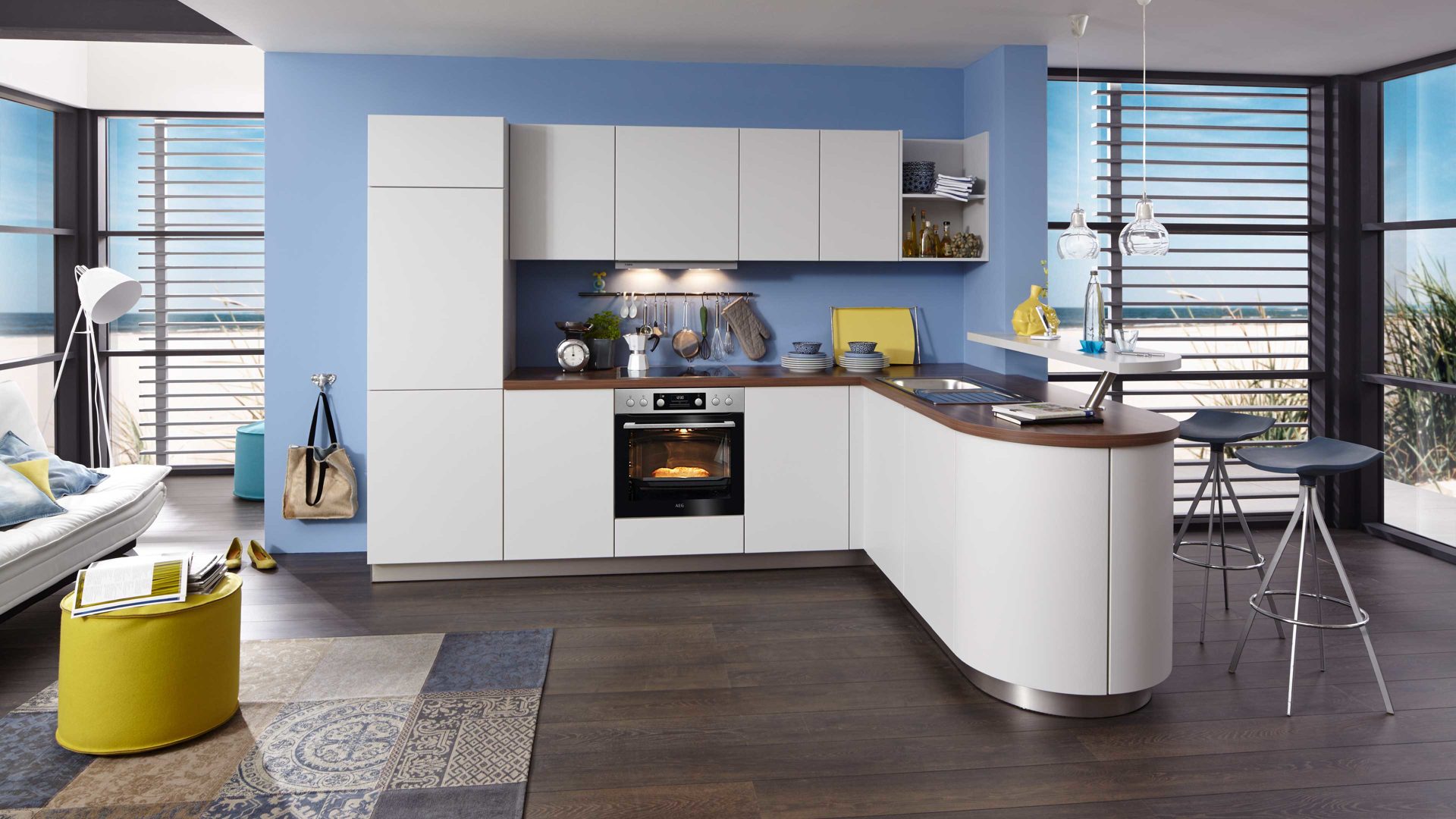 Der L-Block mit gerundeten Unterschrank-Elementen hat moderne Kunststoffoberflächen in Kristallgrau Satin und wirkt freundlich und offen. Der Wangenkorpus in Kristallgrau unterstreicht den modernen Look.