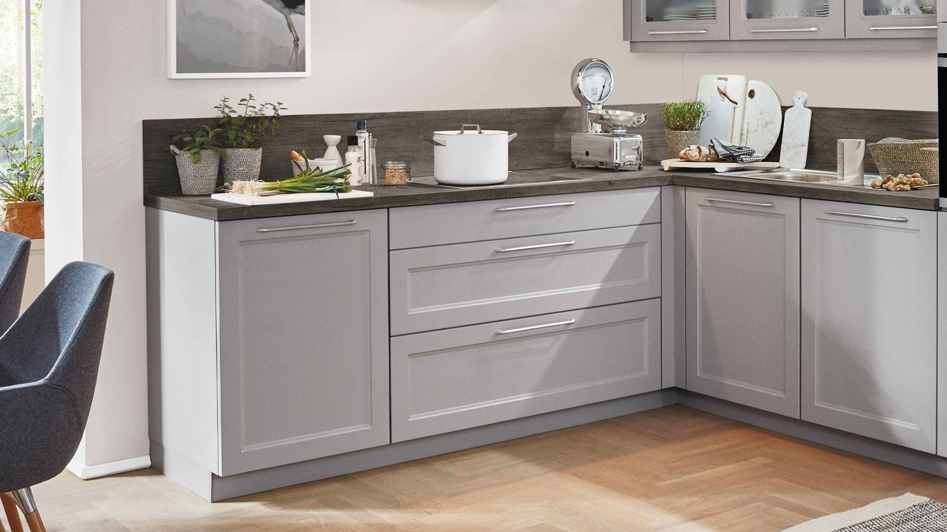Die moderne nobilia® Einbauküche Cascada im angesagten Landhaus-Look kombiniert steingraue Kunststoffoberflächen und Sockelblenden mit einer Arbeitsplatte und Nischenverkleidung in Dakota Eiche-Nachbildung. Edelstahlfarbene Metallgriffe runden die Optik stilsicher ab. Durch die perfekt aufeinander abgestimmten Farbtöne strahlt die qualitativ hochwertige Systemküche puristische Eleganz mit natürlich anmutendem Charme aus.