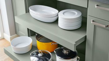 Das Tellerregal sowie weitere dargestellte Einrichtungsgegenstände sind separat gegen Mehrpreis bestellbar.