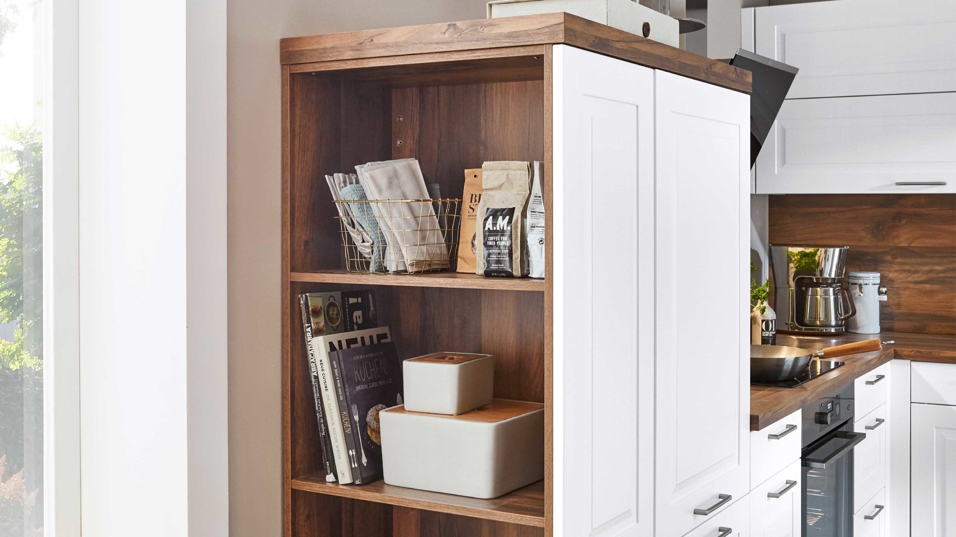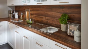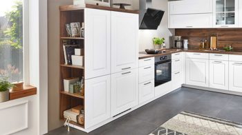 Die nobilia® Einbauküche Sylt kombiniert elegantes Alpinweiß mit Details in dunkler Balkeneiche-Nachbildung für natürliches, warmes Flair.
