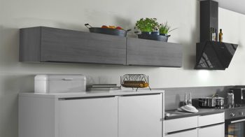 matte hellgraue Lacklaminatfronten, kombiniert mit grauer Eiche-Nachbildung